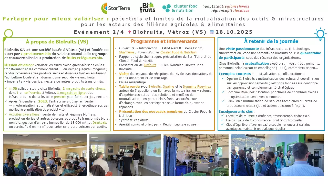 Ces rendez-vous, sous forme de visites, découvertes et réseautage, se sont déroulés sur trois sites d’innovation phares en Suisse, à disposition pour développer des projets en lien avec les filières agricoles et agroalimentaires !